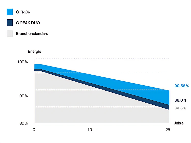 Qcells Solarmodule mit Q.ANTUM DUO Z Technology überzeugen nicht nur durch ihre beeindruckende Leistung unter Realbedingungen, sondern auch durch erstklassige Garantien: 98 % Leistung im ersten Jahr und 86 % nach 25 Jahren.